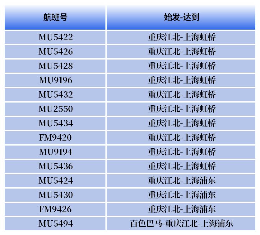 (注:经停其他城市到上海的航班不属于沪渝快线,如MU5440 重庆-信阳-浦东等航班)