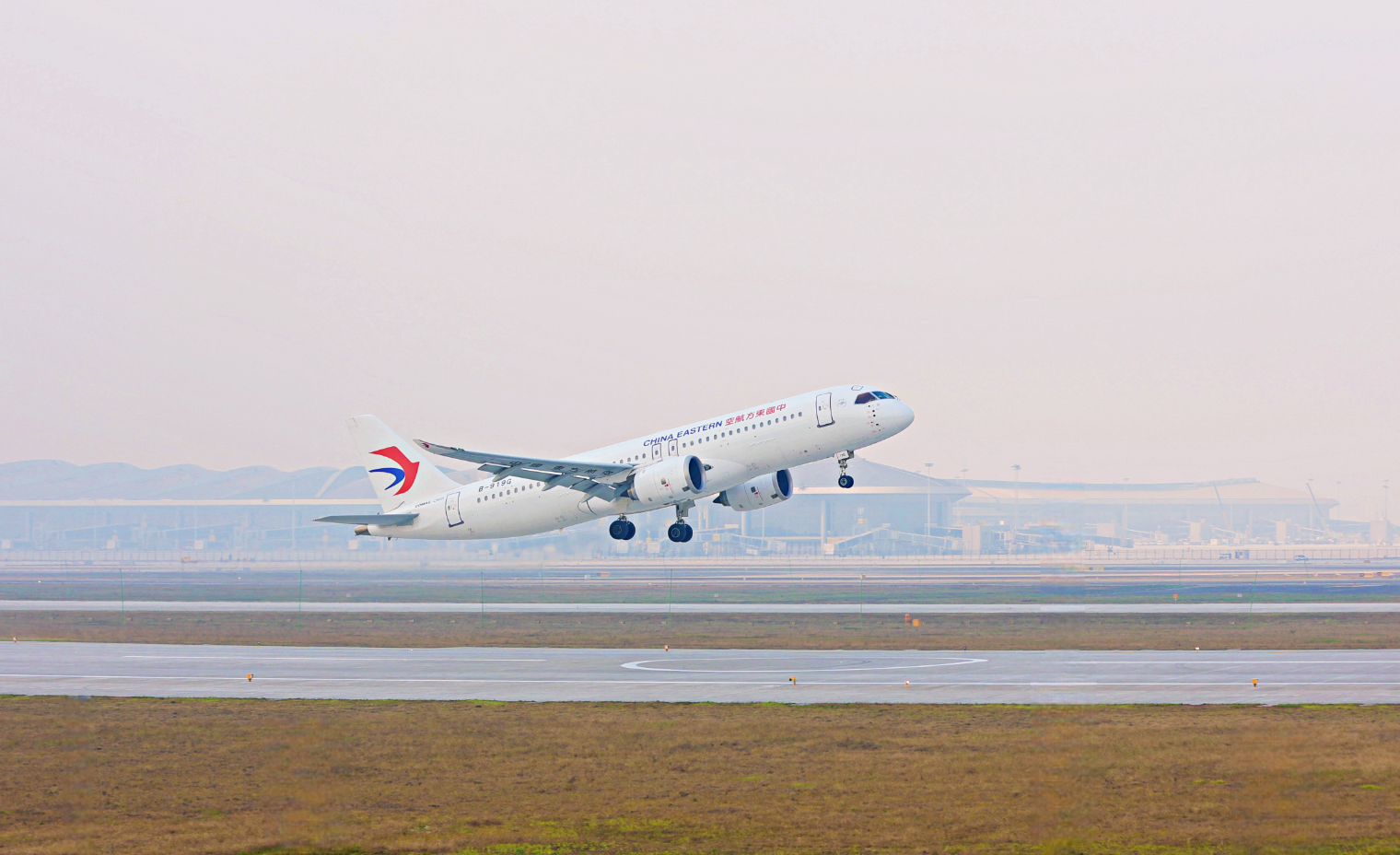 (东航国产大飞机C919正在起飞)