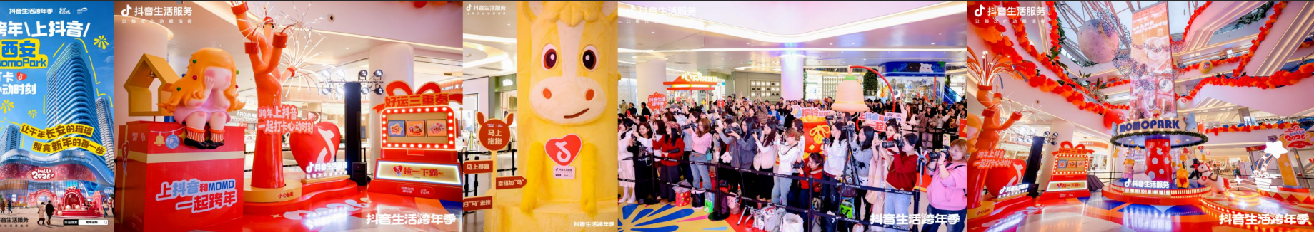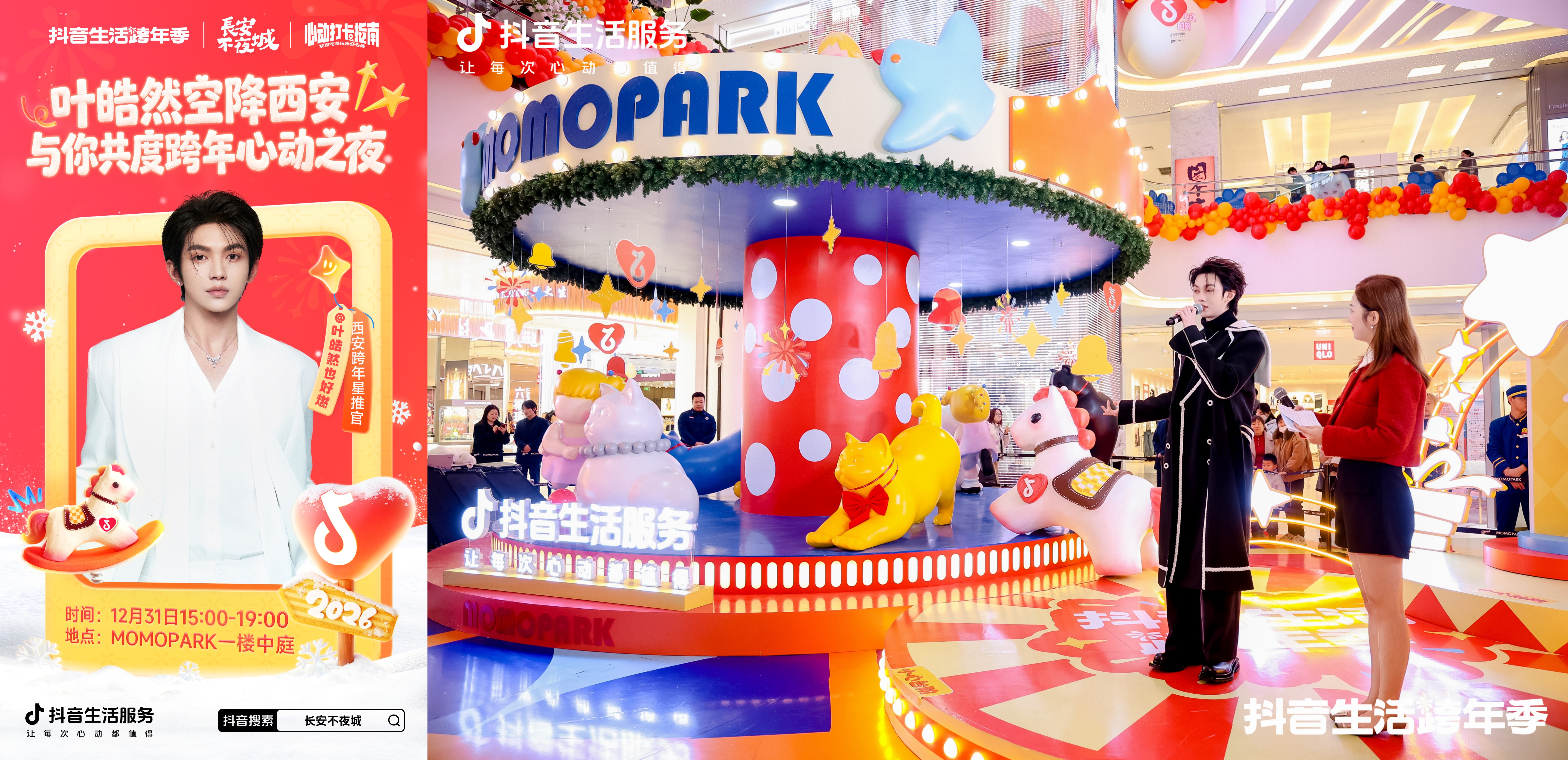 与大唐芙蓉园的传统年味形成鲜明对比的,是momopark艺术购物中心的潮流狂欢。12月31日,人气明星叶皓然作为西安“跨年星推官”空降商场一楼中庭,开启了长达3小时的近距离粉丝互动。从1V1专属互动到后续的欢乐游戏环节,现场气氛持续沸腾。抖音生活服务还为此次活动量身打造了系列趣味打卡点:“心动光盒”、“时光回廊”沉浸式装置、“好运三重奏”打卡点等,共同构建了一条充满情感节点的跨年动线。