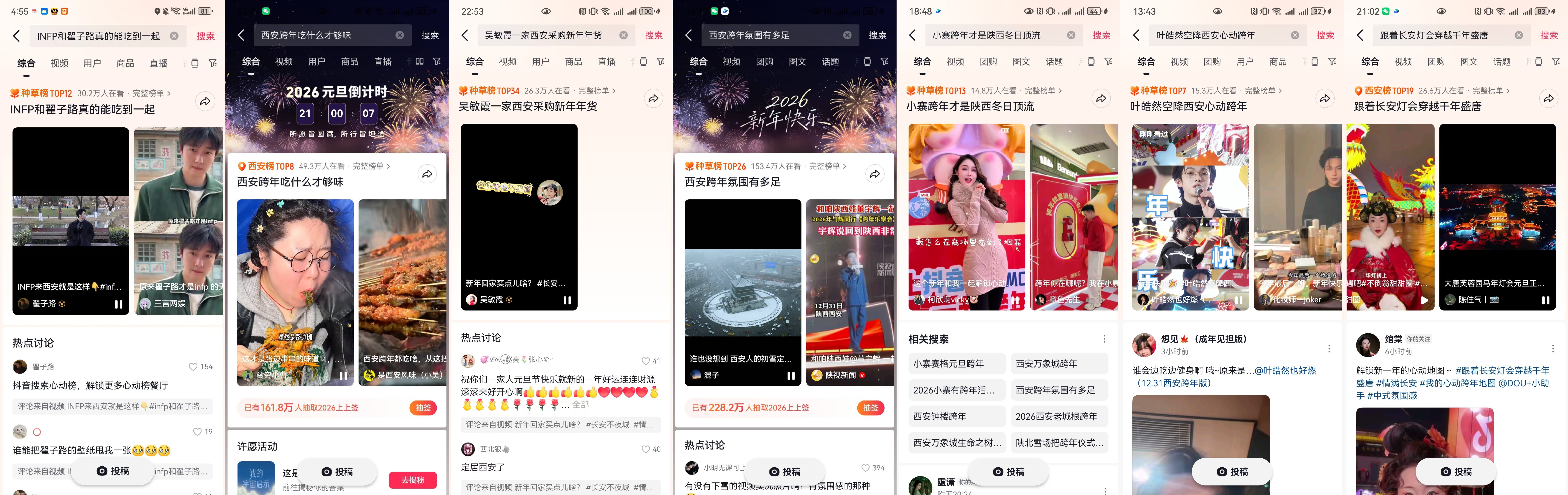 除了双会场联动和明星空降,本次抖音生活服务“长安不夜城”IP在跨年活动期间,还上线了7个热点话题,其中种草榜5个,同城榜2个,总话题播放量更是破亿,形成了全方位、多层次的传播矩阵。