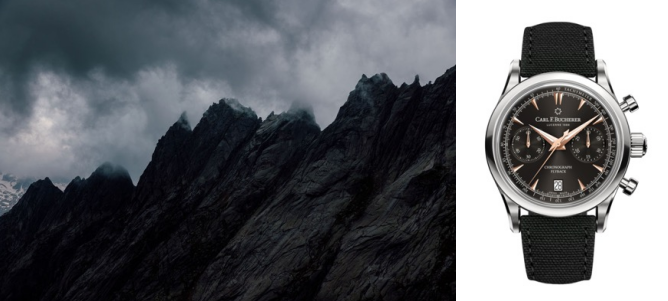 Hannes拍摄的山脉岩石之黑与黑色款马利龙飞返计时码表 (Manero Flyback)