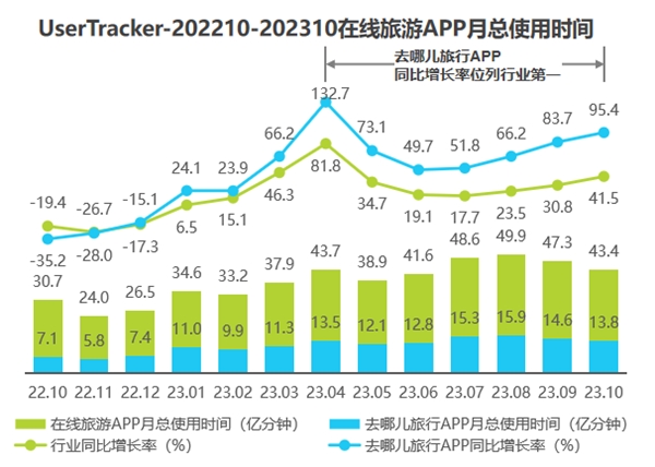 《报告》显示,从月独立设备数看,去哪儿旅行APP流量增势显著,用户流量平均同比增速约为行业总体的1.4倍,2023年5月之后同比增速更是领先同业其他品牌;10月用户流量占据行业22.7%,属于行业头部品牌。